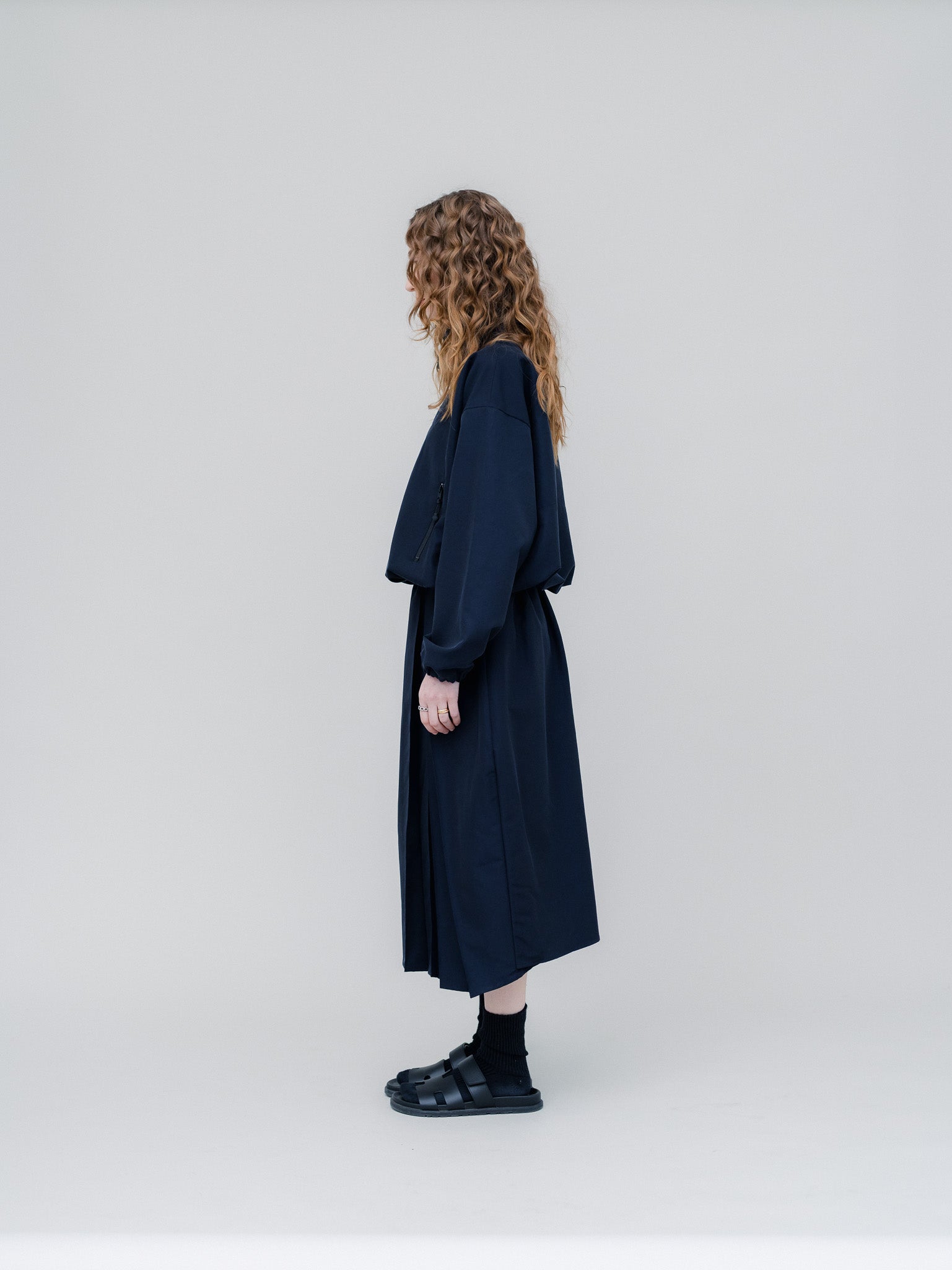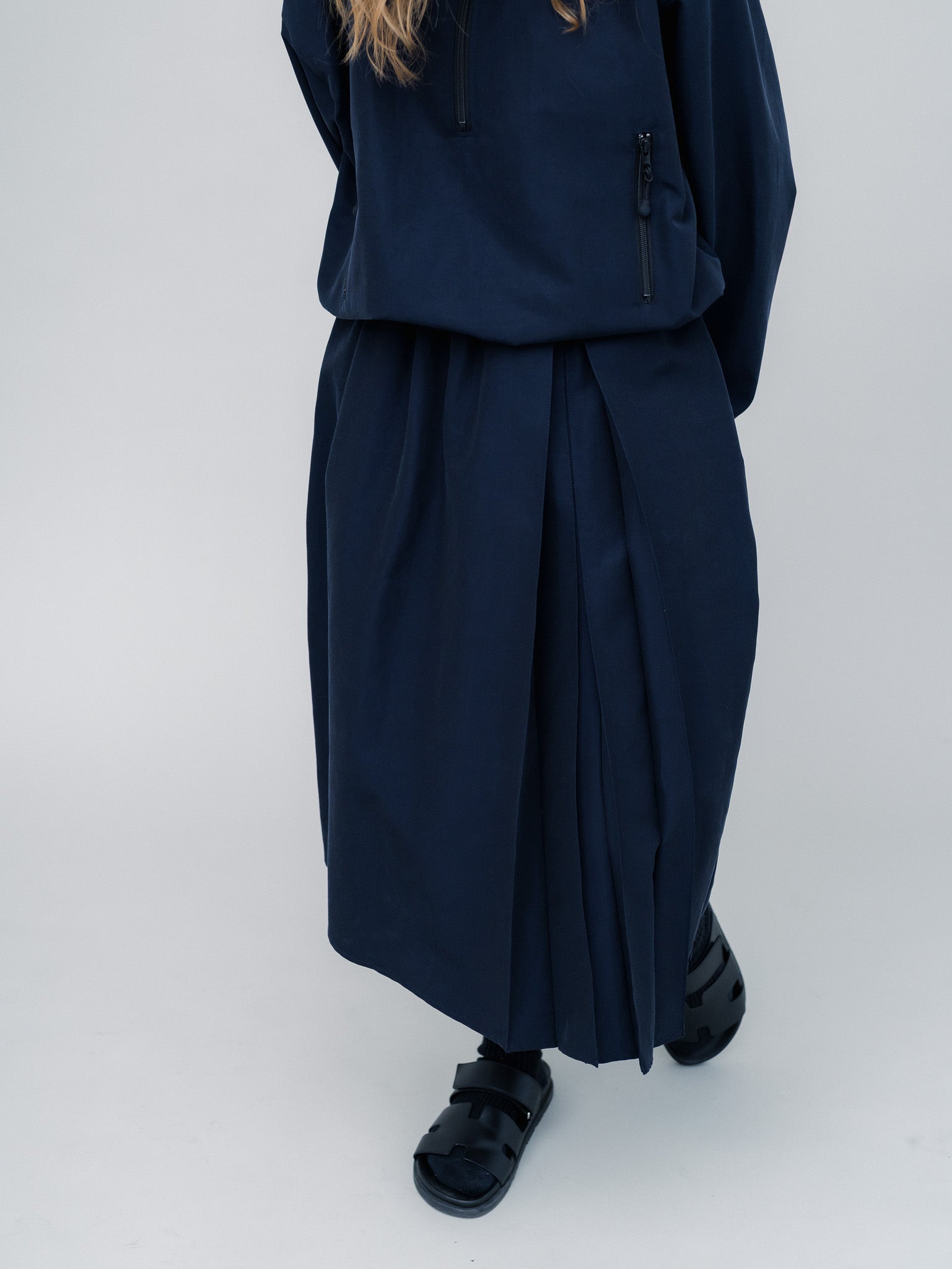 トップスのジップの開き具合や、タックの位置を変えることで、シンプルながらも奥行きのあるスタイリングが完成します。