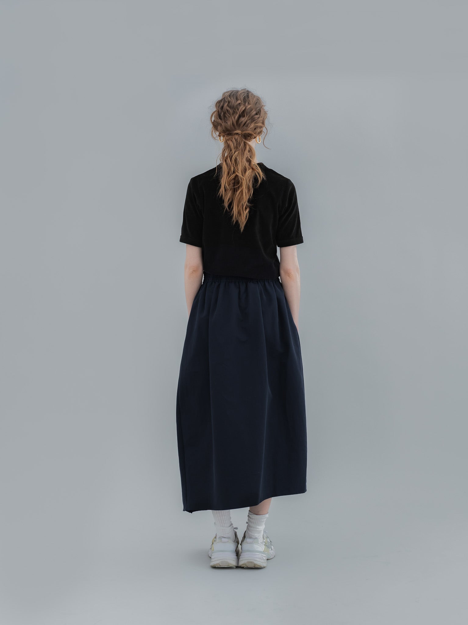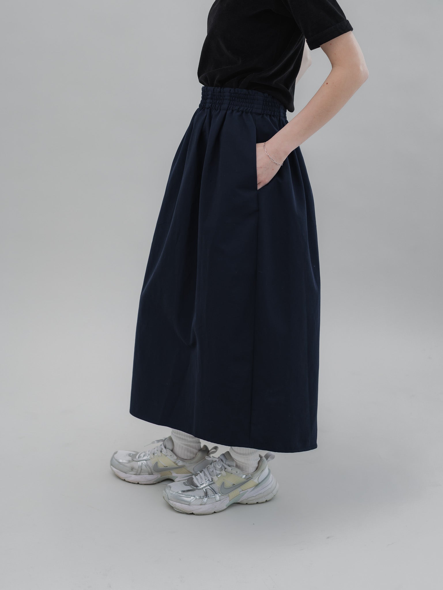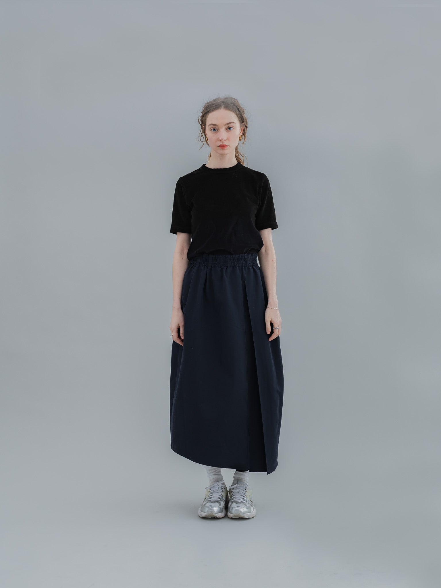 足元はスニーカー、ローファー、フラットシューズとも相性がよく、スタイリングの幅が広がります。