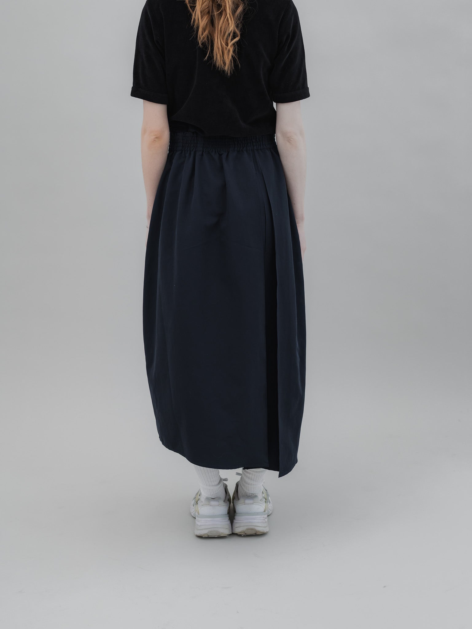 ウエスト下から裾にかけて、美しいタックを施し、動くたびに自然な立体感が生まれるデザイン。